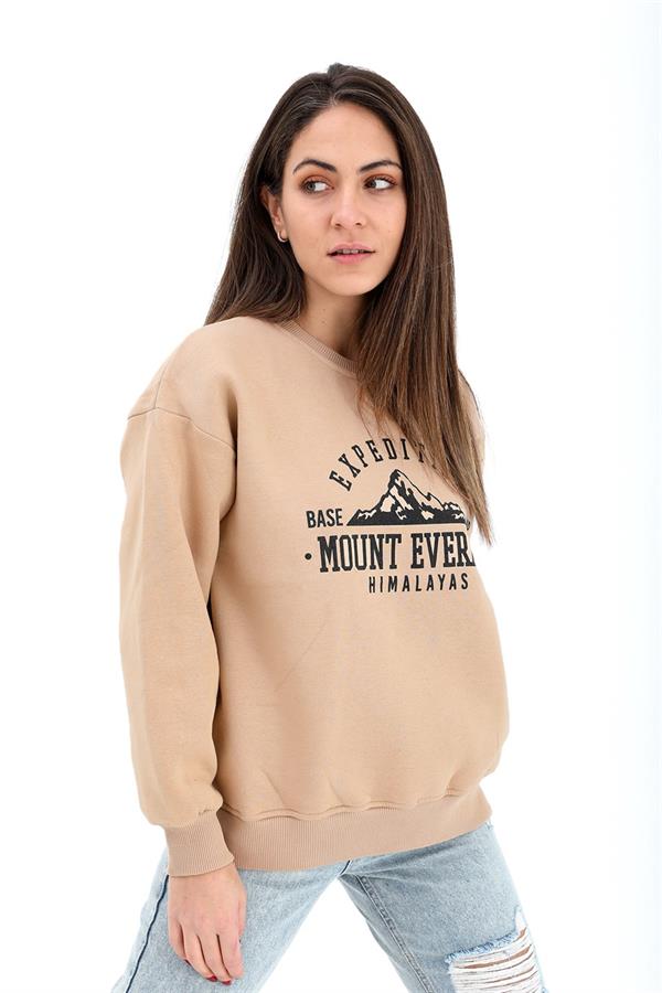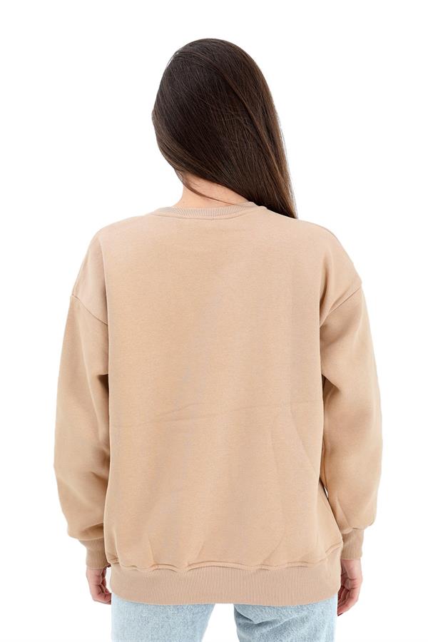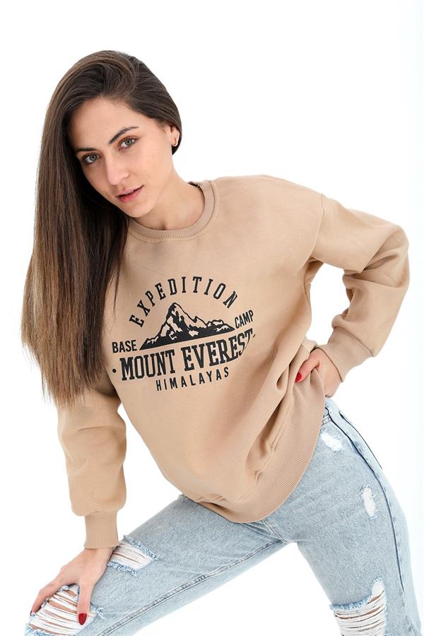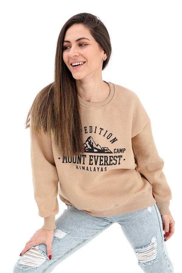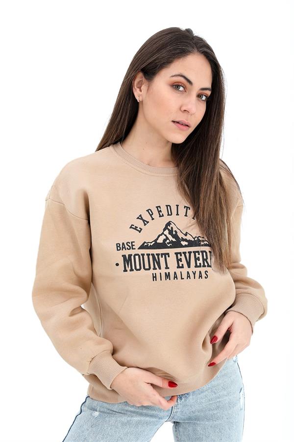 Bisiklet Yaka Baskılı Üç İplik Sweat - Bej