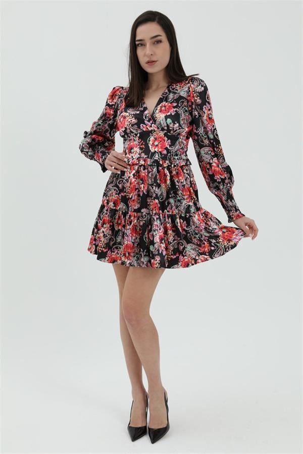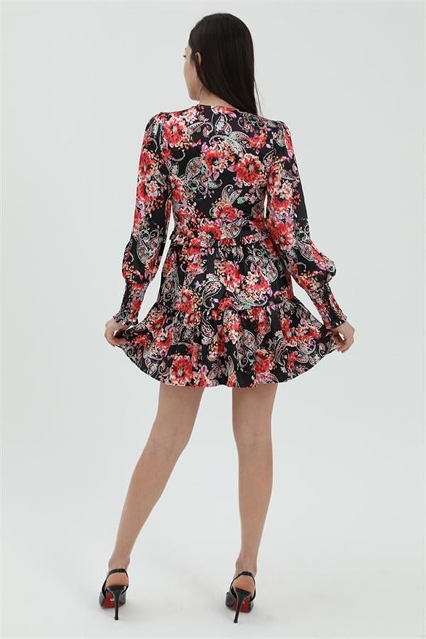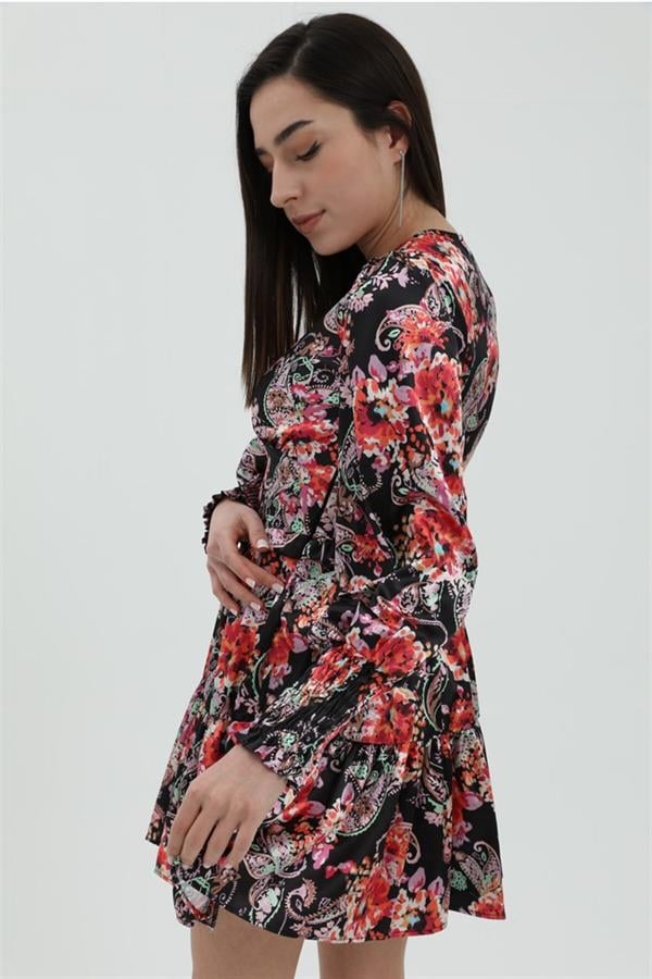 Çiçek Desenli Saten Elbise - Siyah