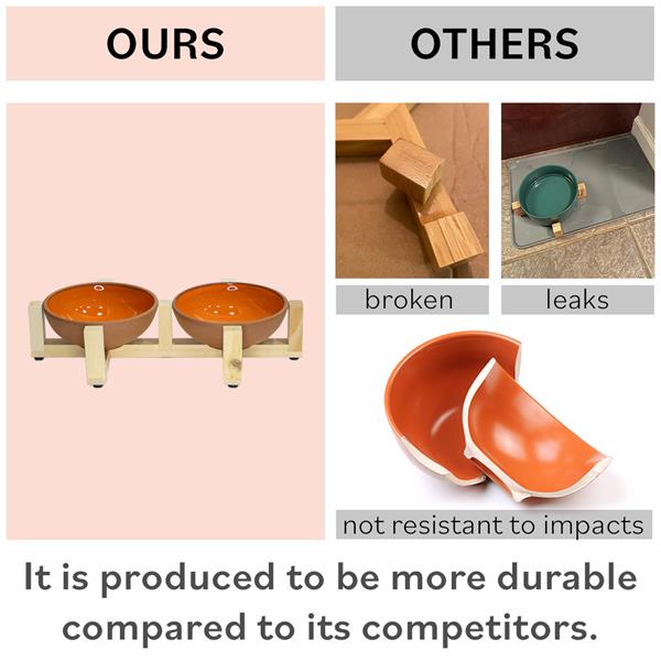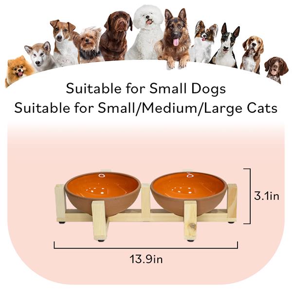 Doğal Sırlı Pişmiş Toprak Kedi Köpek Mama Kabı Ahşap Standlı Anti-Bakteriyel İkili Kedi Köpek Kaseleri