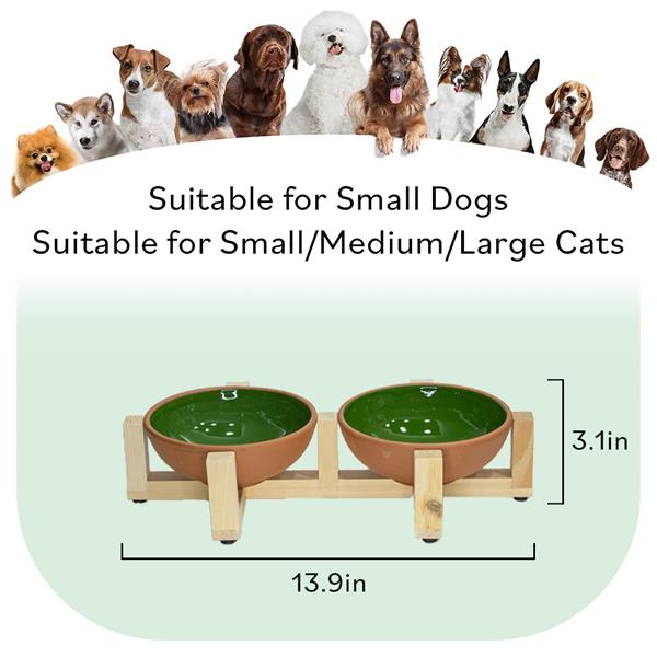 Doğal Sırlı Pişmiş Toprak Kedi Köpek Mama KabıAhşap Standlı Anti-Bakteriyel İkili Kedi Köpek Kaseleri