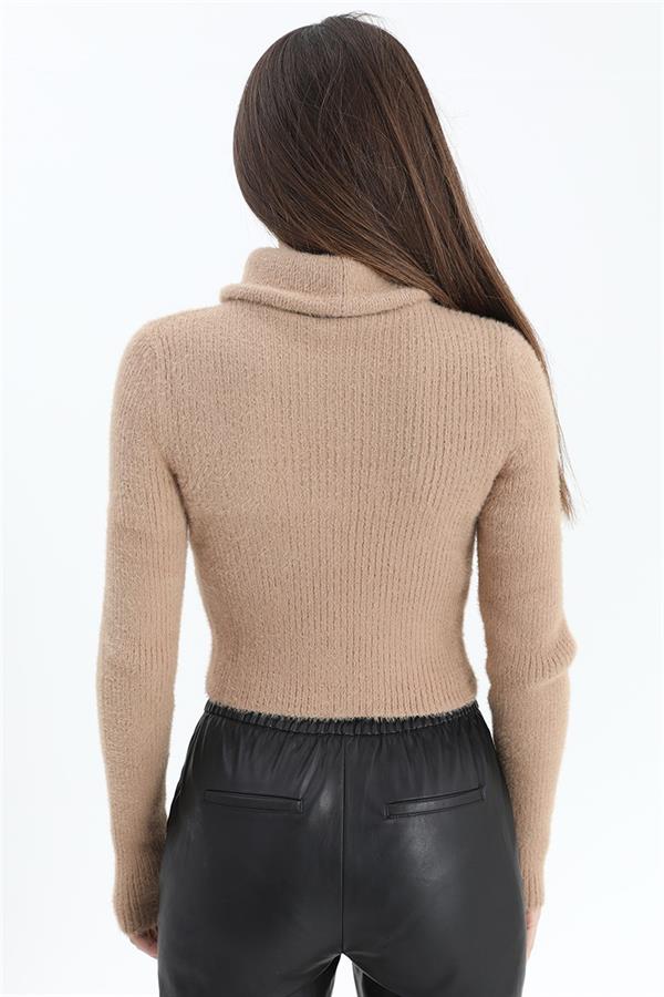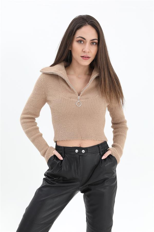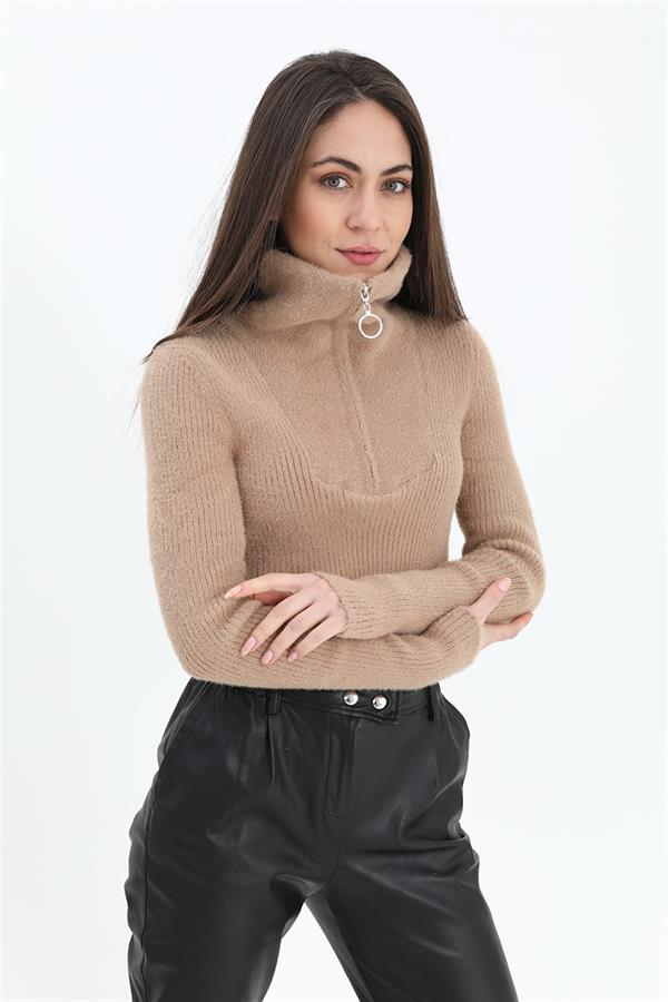 Fermuarlı Fitilli Triko Kazak - Camel