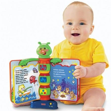 Bebek her sayfadaki masalın şarkısını, harfleri, sayıları ve renkleri öğrenmek için kitabın tam ortasındaki neşeli suratlı tırtılın düğmelerine basar.