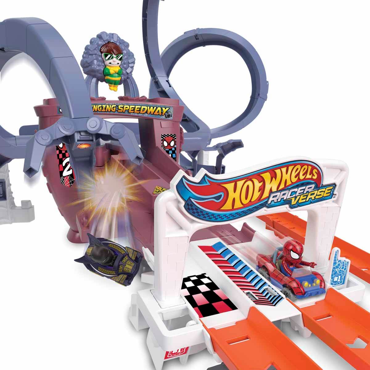 Çocuklar, dahil olan Hot Wheels RacerVerse die cast Spider-Man ve Black Panther araçlarını bir döngüden ve virajlardan beş kez hızla fırlatır.