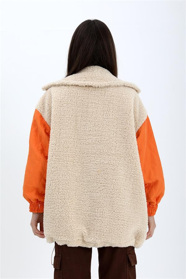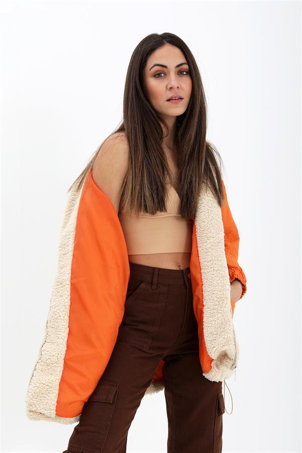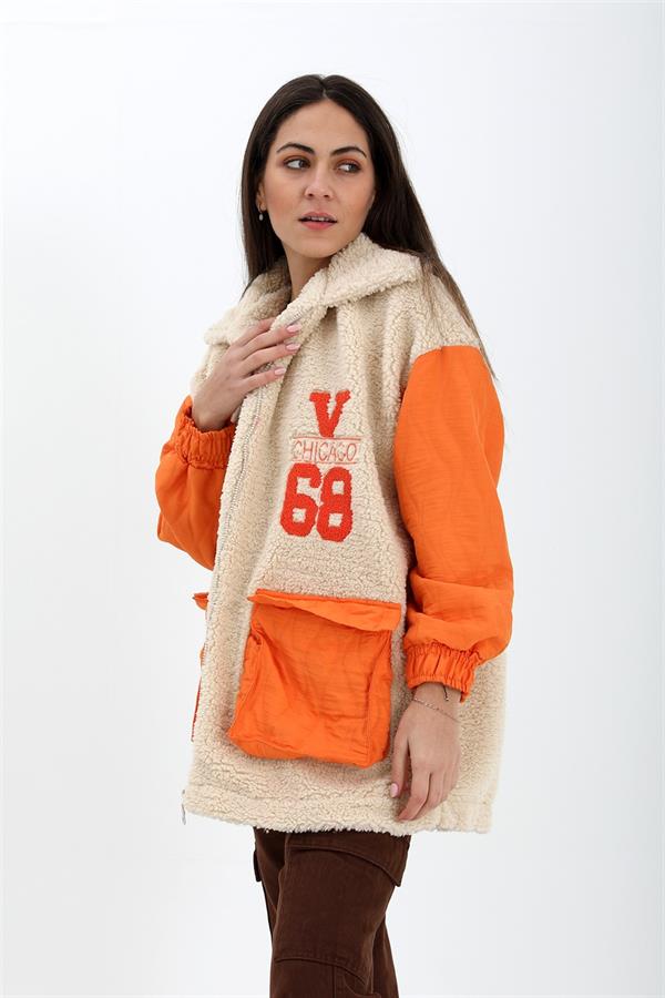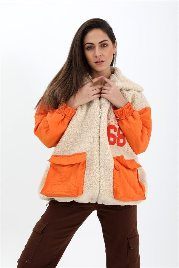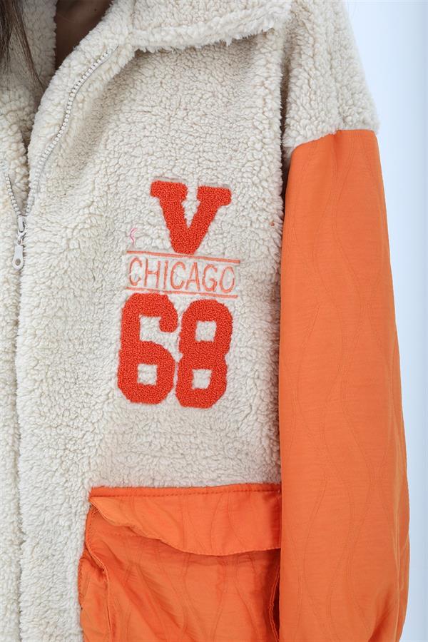 Kapitoneli Nakışlı Peluş Mont - Turuncu