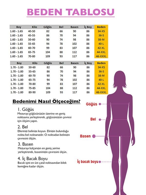 Modelin Ölçüleri: Boy: 176 m, Kilo: 55, Göğüs: 87, Bel: 63, Basen: 93Modelin Üzerindeki Ürün S Bedendir. Ürün Boyu S: 71 cm Göğüs: 61 cm Kol: 61 cmÜrün Boyu M: 72 cm Göğüs: 62 cm Kol: 61 cmÜrün Boyu L: 73 cm Göğüs: 65 cm Kol: 61 cmÜrünlerimiz Tam Kalıptır. Günlük Hayatta Kullandığınız Bedeni Satın Almanız Tavsiye Edilir.Yıkama Talimatı: 30 dereceye kadar hassas veya kırışık azaltma döngüsü ve sentetik döngüsünde yıkayınız. Ürün ağartıcı ile yıkanmamalıdır sadece renkli ve hafif deterjan kullanılmalıdır.Konsept Çekimlerinde Renkler Işık Farklılığından Dolayı Değişiklik Gösterebilir.Yıkama Talimatı: Kuru Temizleme Yapılabilir.