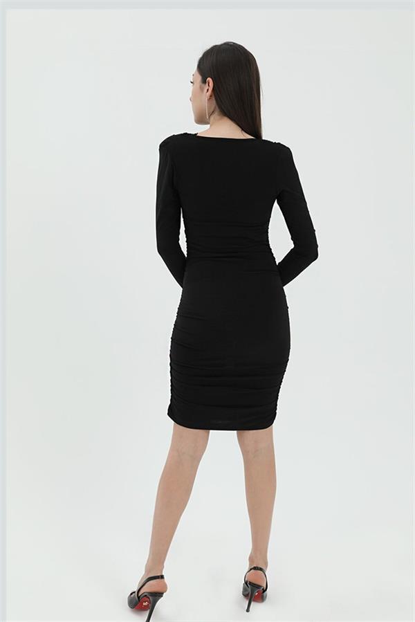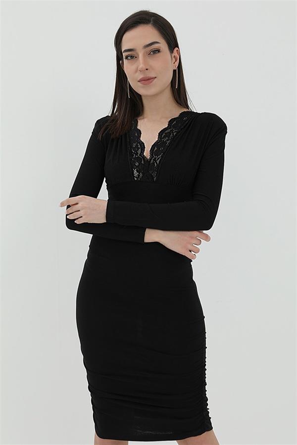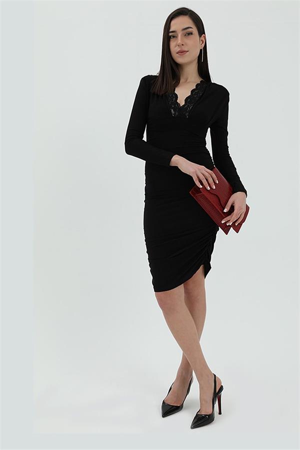 Kruvaze Yaka Dantelli Elbise - Siyah