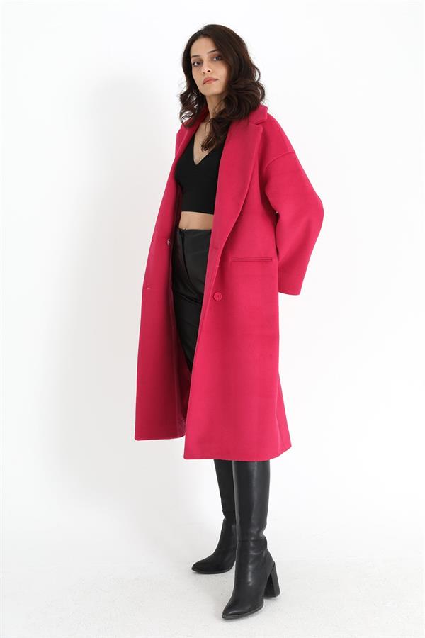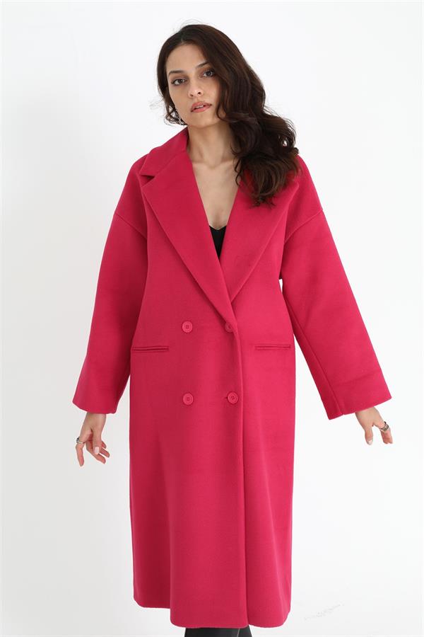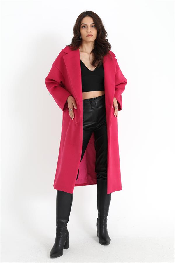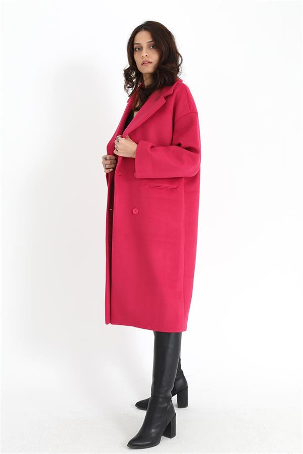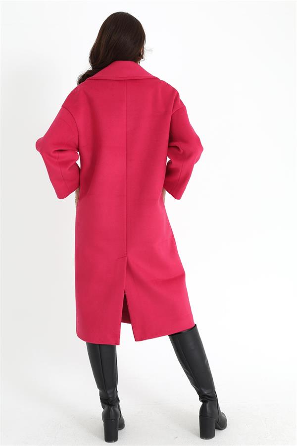 Kruvaze Yaka Uzun Kaşe Kaban - Fuşya