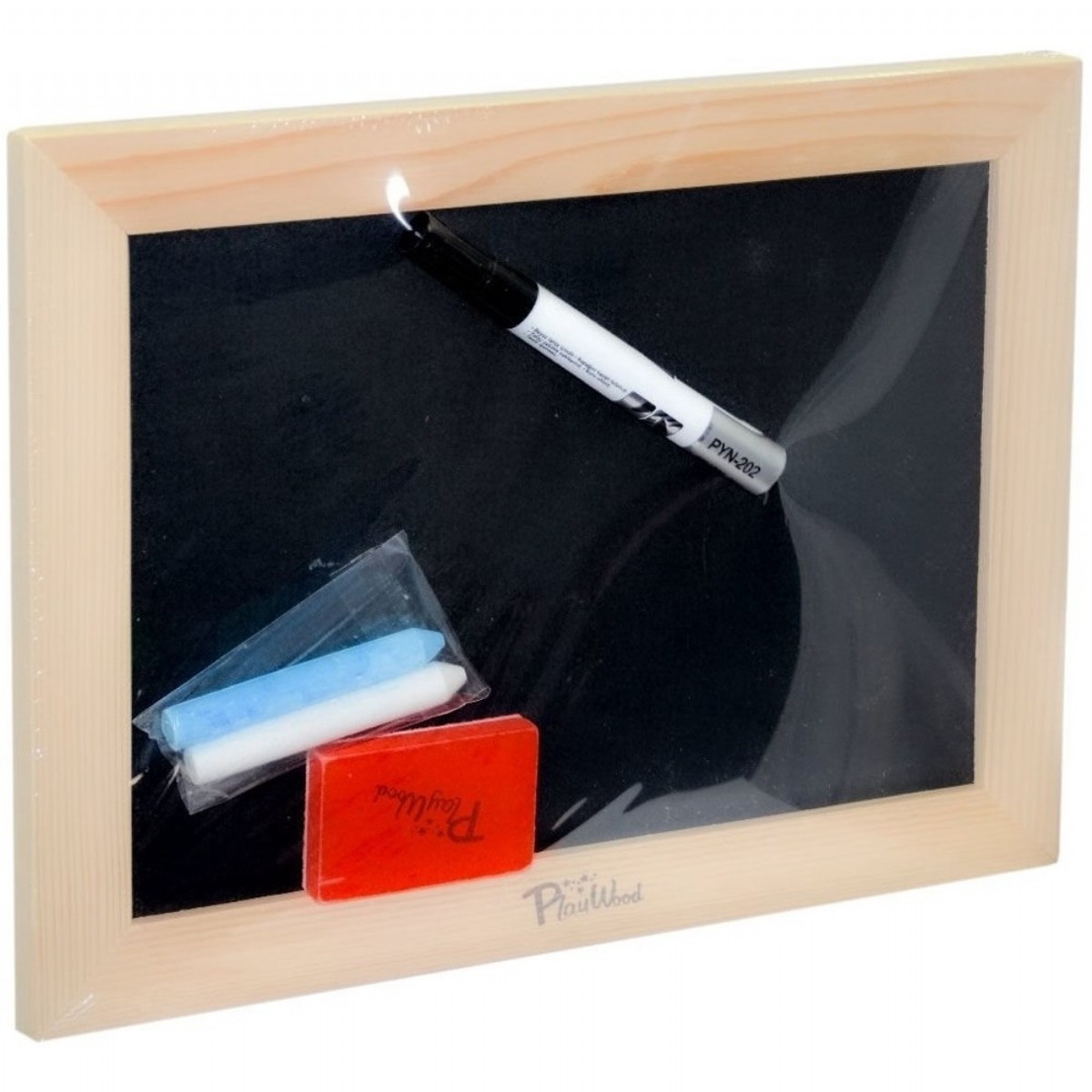 Paket içerisinde; tebeşir, tahta silgisi, çift taraflı tablet yazı tahtası bulunmaktadır.